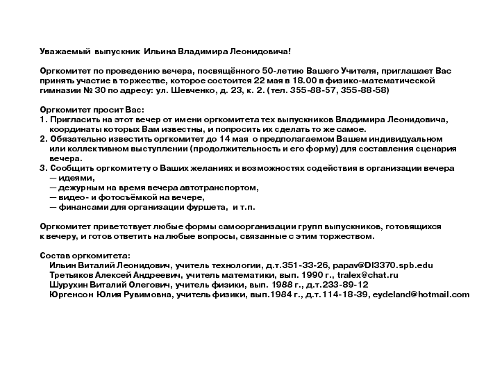 Wed May 30 04:57:19 2001 M.L.Shifman (vyp.1954g.) at michl@overlink.ru: Subject: jubilei! Dorogie moi vypuskniki 1971,1981,1991godov! 1 ijunja vy otmetite 30,20,10-letnie jubilei nachala svoey ekzamenatsionnoy vypusknoy "epopei" v 30-oy shkole. Ja pozdravljaju vas vseh - gde by vy ni nahodilis`( v Rossii ili za ee predelami) i zhelaju Zdorov`ja i Udachi, Dobra i`Blagopoluchija vam i vashim blizkim. Nadejus`, chto v serdtse kazhdogo iz vas ostalas` "chastichka" NASHEY shkoly .Kazhdoe pokolenie vypusknikov bylo horoshim po- svoemu. Kazhdiy iz vas zalozhil "svoy kirpichik" v fundament togo, chto nynche zovetsja "TRIDTSATKOY" i ob`edinjaet vseh nas - ee vypusknikov. Uspehov vam vo vseh vashih nachinanijah! Vash M.L.Shifman.(vyp.1954g.) I kak by sud`ba "ni motala" po svetu, Ja ochen` hochu, chtob sjuda vas vleklo, Gde zhdut vas vsegda, gde pomogut sovetom, Gde budet spokoyno, nadezhno, teplo! |
