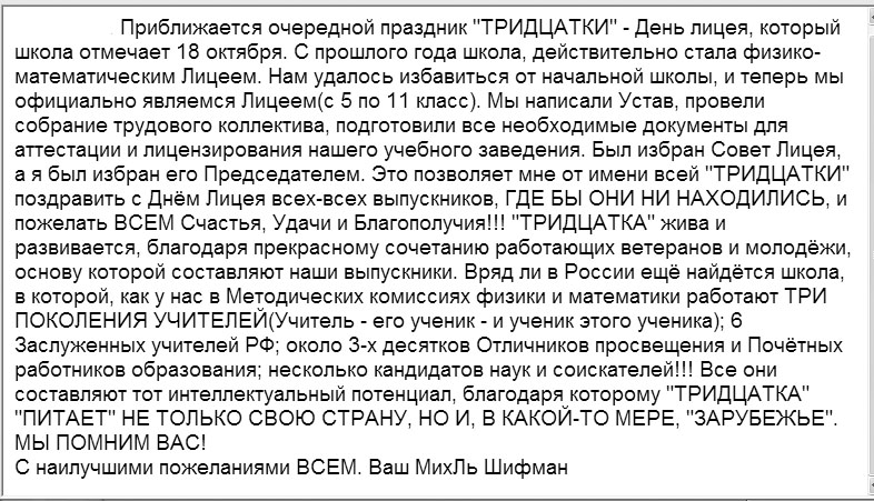 Sun Oct 12 09:34:33 2003 Boris Kozintsev (1989, 4) at bak@hundzor.org: Subject: A message from M.L.Shifman I've got this message from Michail Lvovich today (view as jpeg file): Приближается очередной праздник "ТРИДЦАТКИ" - День лицея, который школа отмечает 18 октября. С прошлого года школа, действительно стала физико-математическим Лицеем. Нам удалось избавиться от начальной школы, и теперь мы официально являемся Лицеем(с 5 по 11 класс). Мы написали Устав, провели собрание трудового коллектива, подготовили все необходимые документы для аттестации и лицензирования нашего учебного заведения. Был избран Совет Лицея, а я был избран его Председателем. Это позволяет мне от имени всей "ТРИДЦАТКИ" поздравить с Днём Лицея всех-всех выпускников, ГДЕ БЫ ОНИ НИ НАХОДИЛИСЬ, и пожелать ВСЕМ Счастья, Удачи и Благополучия!!! "ТРИДЦАТКА" жива и развивается, благодаря прекрасному сочетанию работающих ветеранов и молодёжи, основу которой составляют наши выпускники. Вряд ли в России ещё найдётся школа, в которой, как у нас в Методических комиссиях физики и математики работают ТРИ ПОКОЛЕНИЯ УЧИТЕЛЕЙ(Учитель - его ученик - и ученик этого ученика); 6 Заслуженных учителей РФ; около 3-х десятков Отличников просвещения и Почётных работников образования; несколько кандидатов наук и соискателей!!! Все они составляют тот интеллектуальный потенциал, благодаря которому "ТРИДЦАТКА" "ПИТАЕТ" НЕ ТОЛЬКО СВОЮ СТРАНУ, НО И, В КАКОЙ-ТО МЕРЕ, "ЗАРУБЕЖЬЕ". МЫ ПОМНИМ ВАС! С наилучшими пожеланиями ВСЕМ. Ваш МихЛь Шифман |