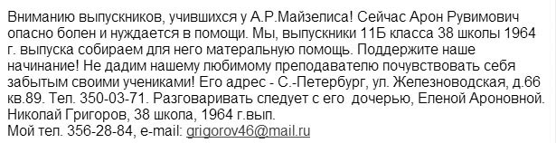 Mon Oct 27 19:46:47 2003 Boris Kozintsev (1989, 4) at bak@hundzor.org: Subject: A message from N. Grigorov I've got this message from Nikolai Grigorov (class of 1964) today (view as jpeg): Вниманию выпускников, учившихся у А.Р.Майзелиса! Сейчас Арон Рувимович опасно болен и нуждается в помощи. Мы, выпускники 11Б класса 38 школы 1964 г. выпуска собираем для него матеральную помощь. Поддержите наше начинание! Не дадим нашему любимому преподавателю почувствовать себя забытым своими учениками! Его адрес - С.-Петербург, ул. Железноводская, д.66 кв.89. Тел. 350- 86-29. Разговаривать следует с его дочерью, Еленой Ароновной. Николай Григоров, 38 школа, 1964 г.вып. Мой тел. 356-28-84, e-mail: grigorov46@mail.ru |