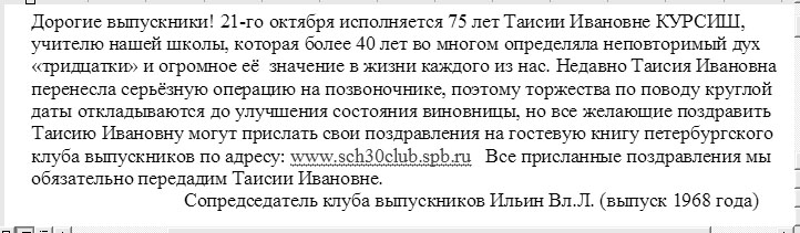 Fri Oct 17 20:24:03 2003 Boris Kozintsev (1989, 4) at bak@hundzor.org: Subject: A message from V.L.Ilyin I've got this message from Vladimir Leonidovich today (view as jpeg file): Дорогие выпускники! 21-го октября исполняется 75 лет Таисии Ивановне КУРСИШ, учителю нашей школы, которая более 40 лет во многом определяла неповторимый дух <тридцатки> и огромное её значение в жизни каждого из нас. Недавно Таисия Ивановна перенесла серьёзную операцию на позвоночнике, поэтому торжества по поводу круглой даты откладываются до улучшения состояния виновницы, но все желающие поздравить Таисию Ивановну могут прислать свои поздравления на гостевую книгу петербургского клуба выпускников по адресу: www.sch30club.spb.ru. Все присланные поздравления мы обязательно передадим Таисии Ивановне. Сопредседатель клуба выпускников Ильин Вл.Л. (выпуск 1968 года) |